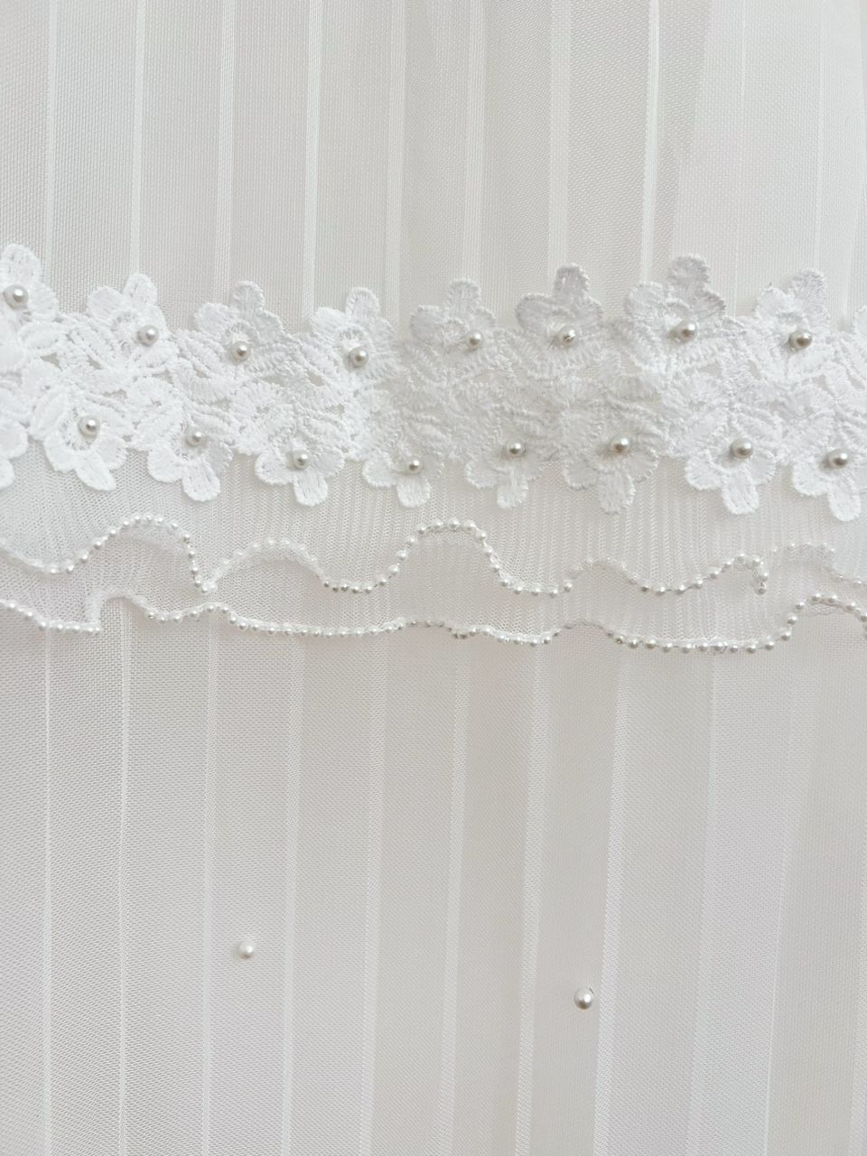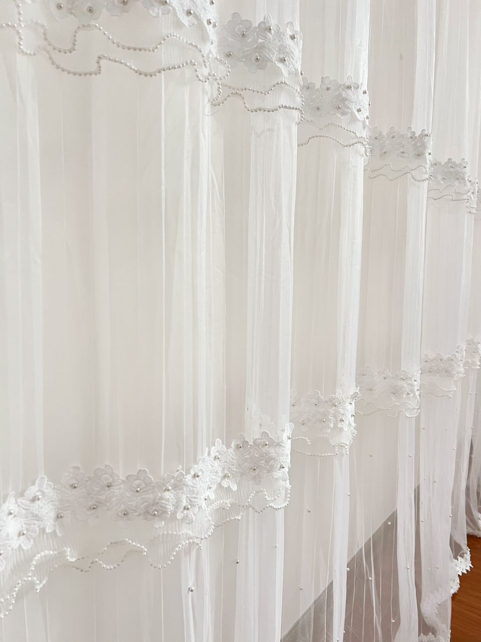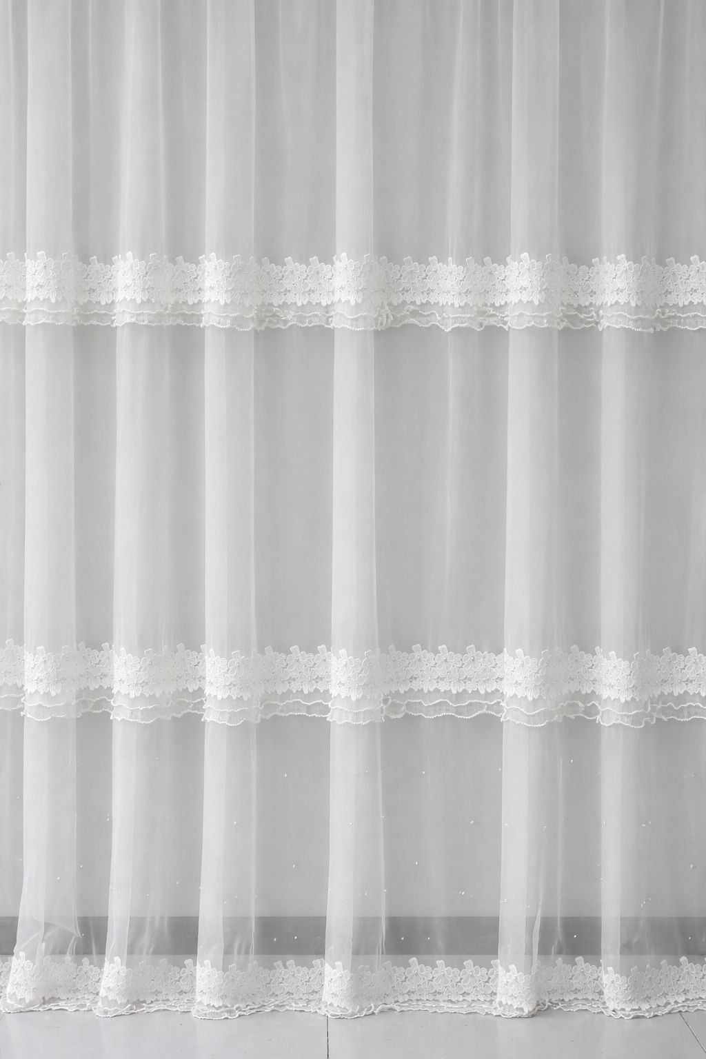 Model zdobią poziome pasy finezyjnej gipiury, które nadają całości wyjątkowego charakteru i podkreślają klasyczną elegancję. Dolna część firany została dodatkowo ozdobiona subtelnymi, połyskującymi kropeczkami, które delikatnie odbijają światło, tworząc efekt lekkości i świeżości.