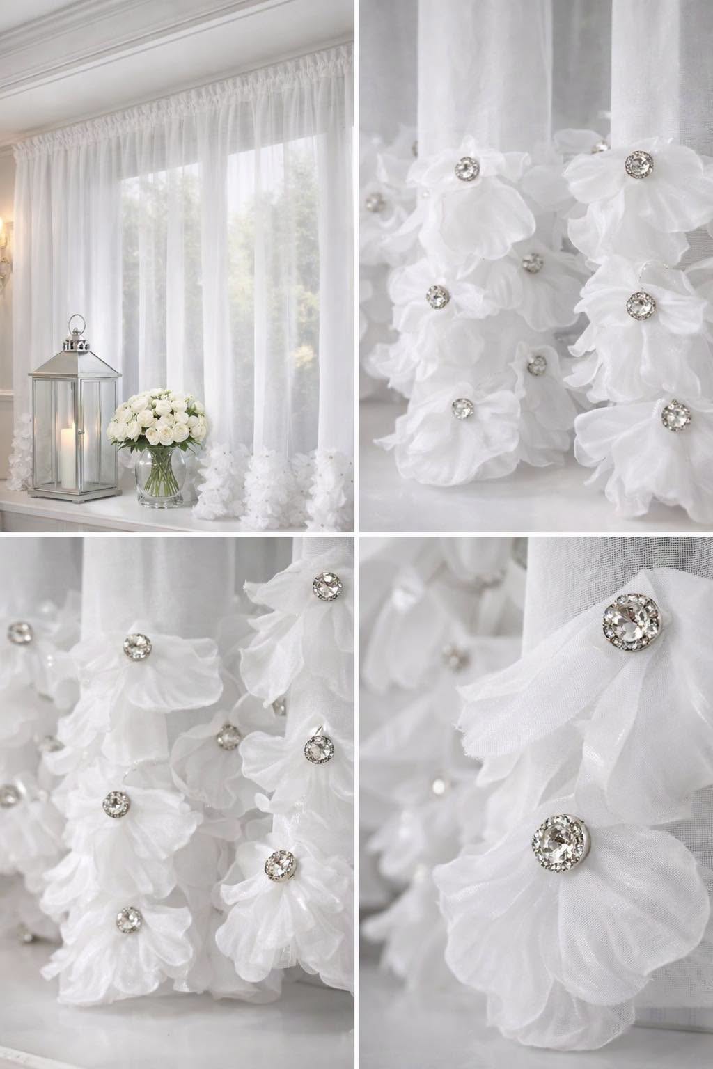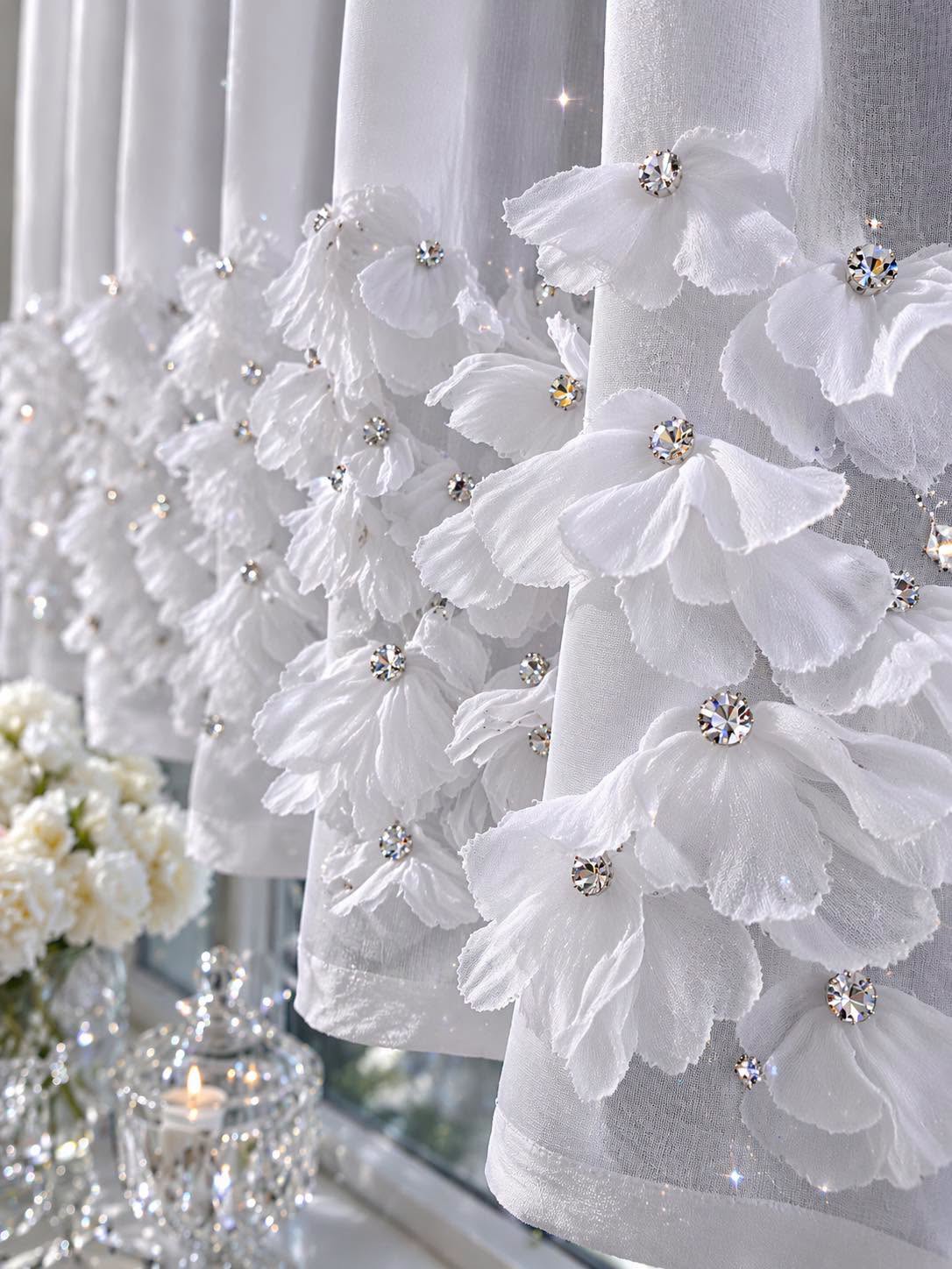 Dolna część firany zdobiona jest efektownymi, przestrzennymi aplikacjami w kształcie delikatnych płatków, które zostały uzupełnione połyskującymi kryształkami. Dzięki temu całość subtelnie mieni się w świetle dziennym i sztucznym, nadając wnętrzu eleganckiego, lekko glamour charakteru.