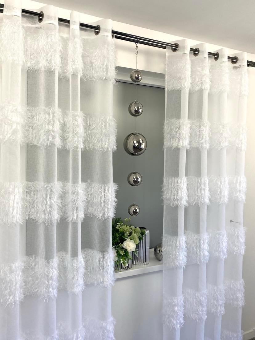 Dodaj wnętrzu subtelnej elegancji i wyjątkowego uroku dzięki firanie „Feather Light”. Wykonana z lekkiego, transparentnego materiału w śnieżnobiałym odcieniu, została ozdobiona rzędami delikatnych, puszystych piór, które tworzą efekt przestrzennej lekkości i luksusu.