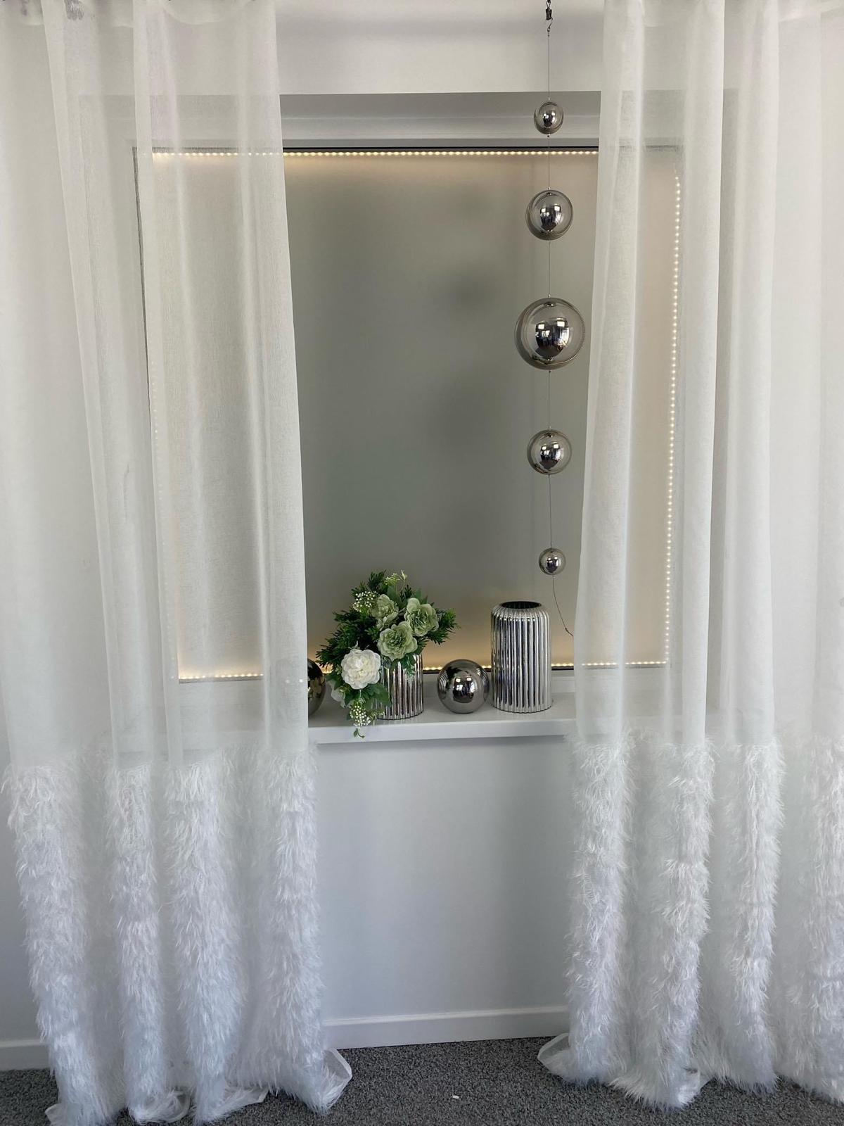 Firana „Feather Touch” to kwintesencja lekkości i wyrafinowanego stylu. Wykonana z delikatnego, białego szyfonu, subtelnie rozprasza światło, nadając wnętrzu jasność, przestrzeń i elegancki charakter. Jej wyjątkowym atutem jest dolna część – ozdobiona gęsto naszytymi, miękkimi piórkami, które sięgają aż do 1 metra wysokości. Ten finezyjny detal wprowadza do wnętrza nutę luksusu i lekkości, przypominając o finezji haute couture.