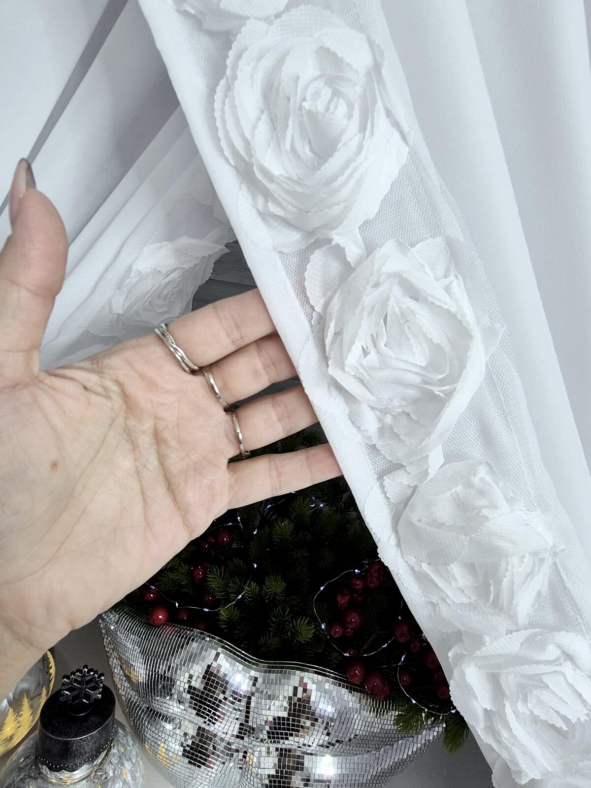Elegancka firana wykonana z delikatnego szyfonu, zakładana na siebie i szyta na jednej taśmie marszczącej, tworzy efektowne, miękkie drapowanie. Jej wyjątkowym atutem jest subtelne wykończenie jednym rzędem ozdobnych róż wzdłuż krawędzi, które dodają całości romantycznego i stylowego charakteru.