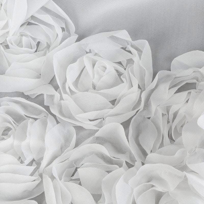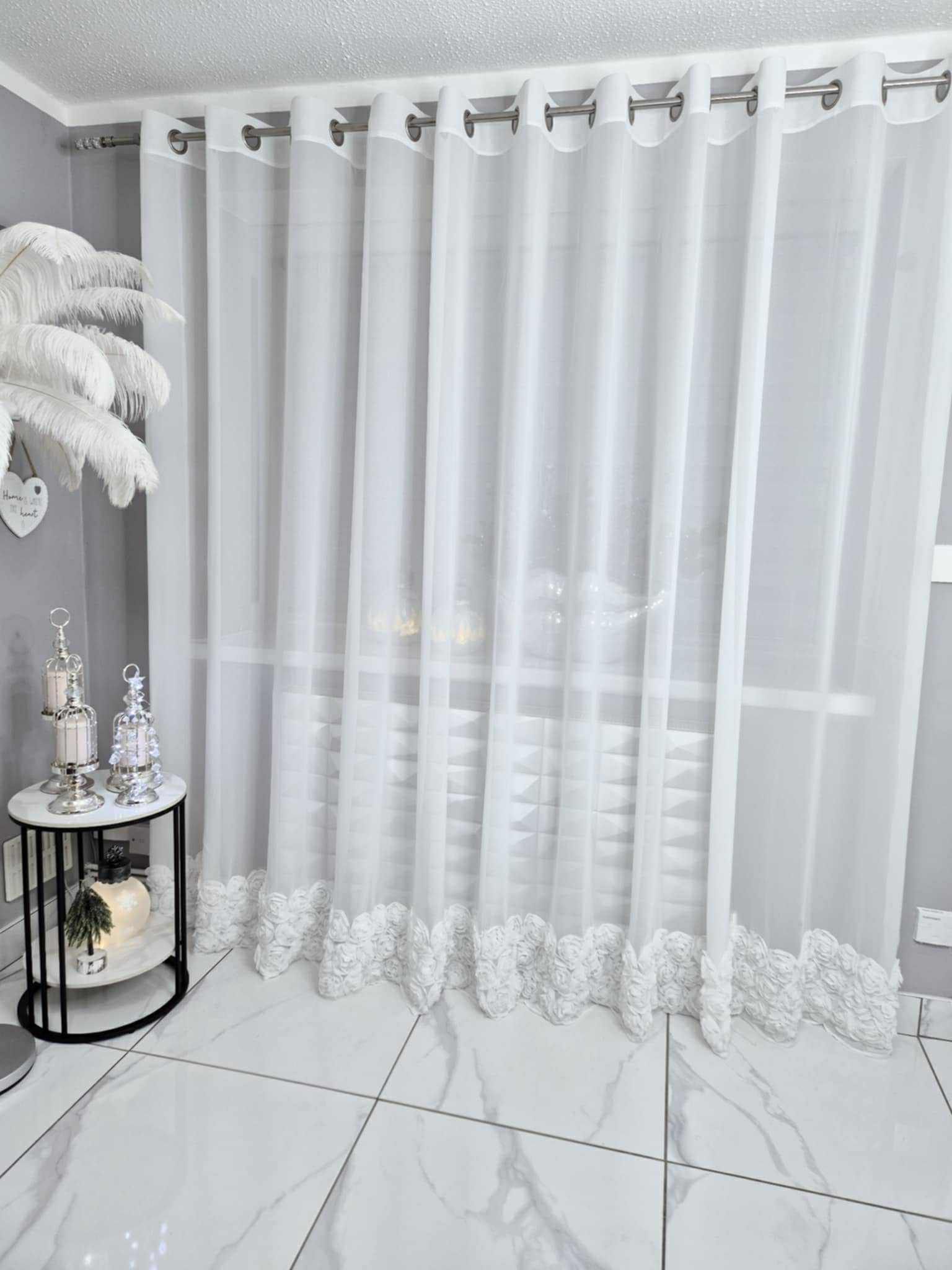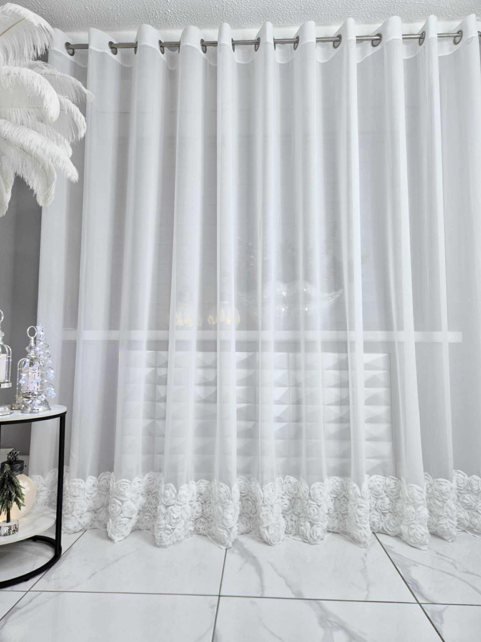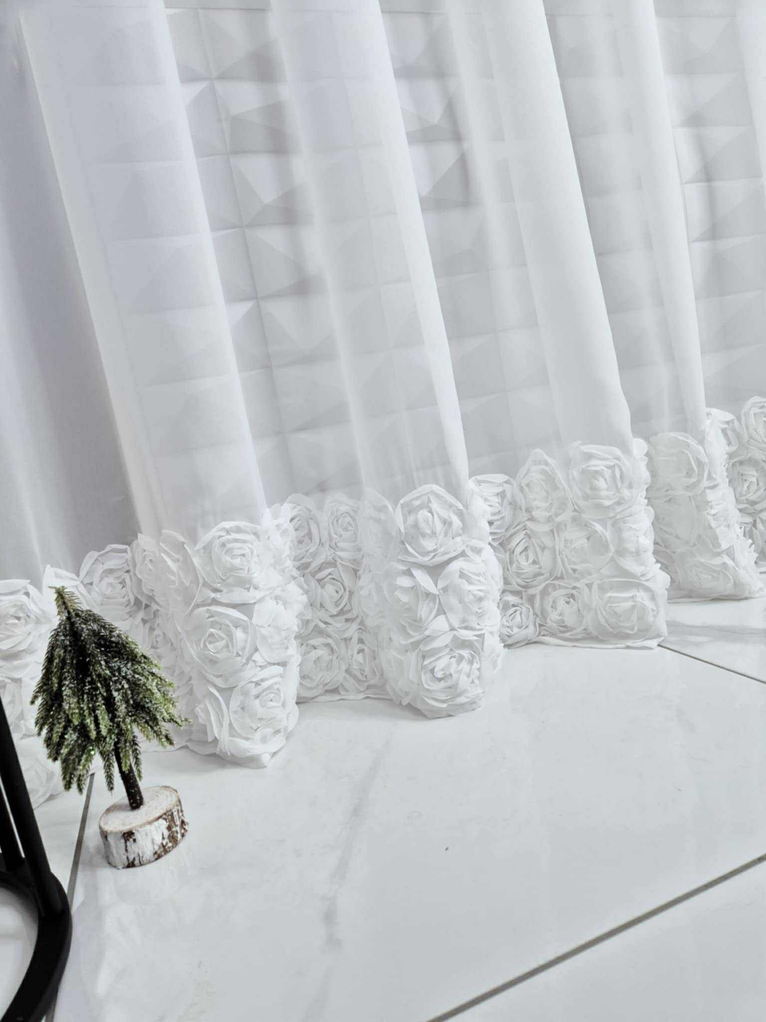 Firany wykonane zostały z delikatnego, lejącego szyfonu, który pięknie układa się na oknie i przepuszcza światło, wprowadzając do wnętrza jasność oraz świeżość. Dolna krawędź została ozdobiona efektownym pasem trójwymiarowych róż 3D, które wyglądają jak ręcznie modelowane kwiaty. To unikatowy, przyciągający uwagę element, który dodaje całości lekkości i artystycznego charakteru.
