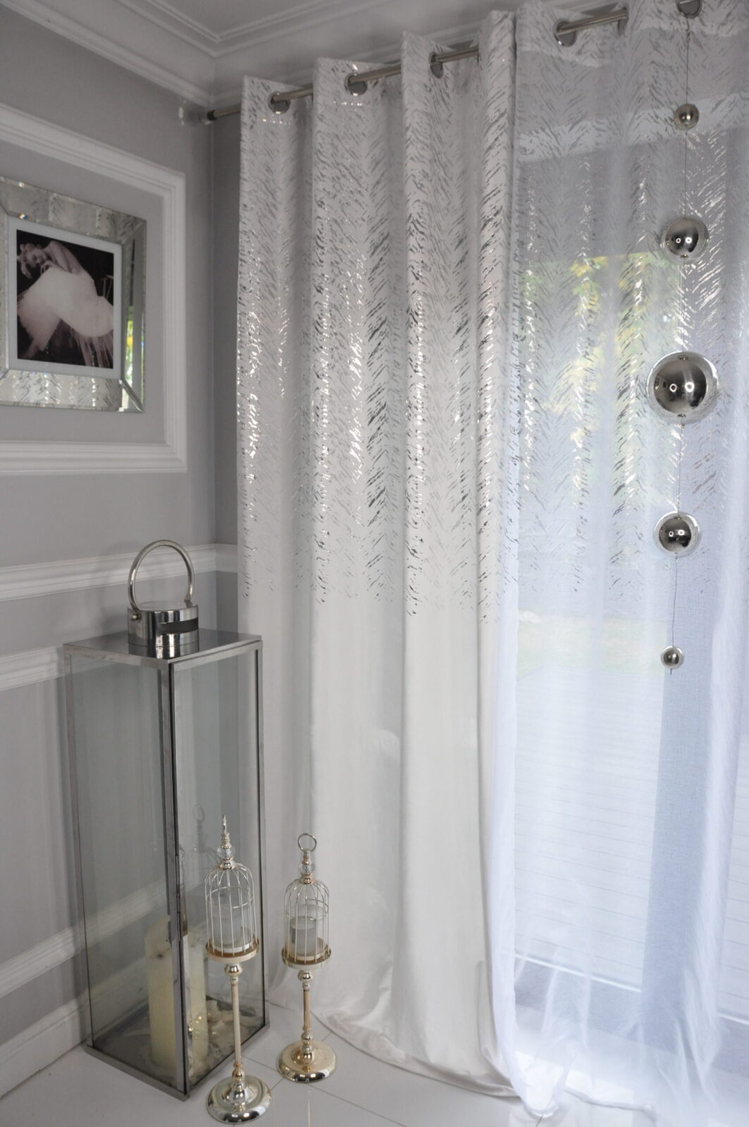 Firana VELVET GLOW 140×250 cm biała | srebrny print | na przelotkach