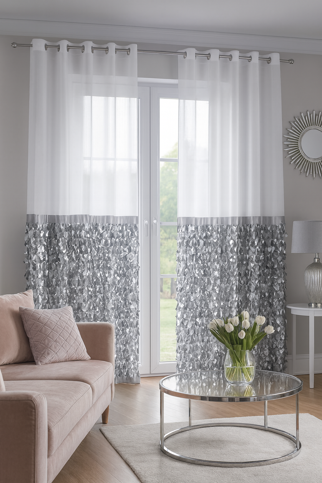 Firana Luna Crystal została zaprojektowana z myślą o wygodzie – przelotki umożliwiają szybki montaż i efektowne układanie na karniszu. Idealna do eleganckich salonów, sypialni i wnętrz, w których liczy się każdy detal.