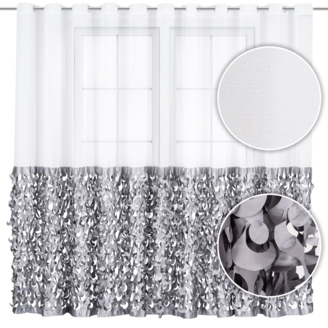 Górna część firany wykonana z delikatnego, półtransparentnego szyfonu elegancko filtruje światło, tworząc przytulną i harmonijną atmosferę. Dolna część, niczym tafla księżycowego światła, przyciąga wzrok swoją przestrzenną strukturą i subtelnym połyskiem.