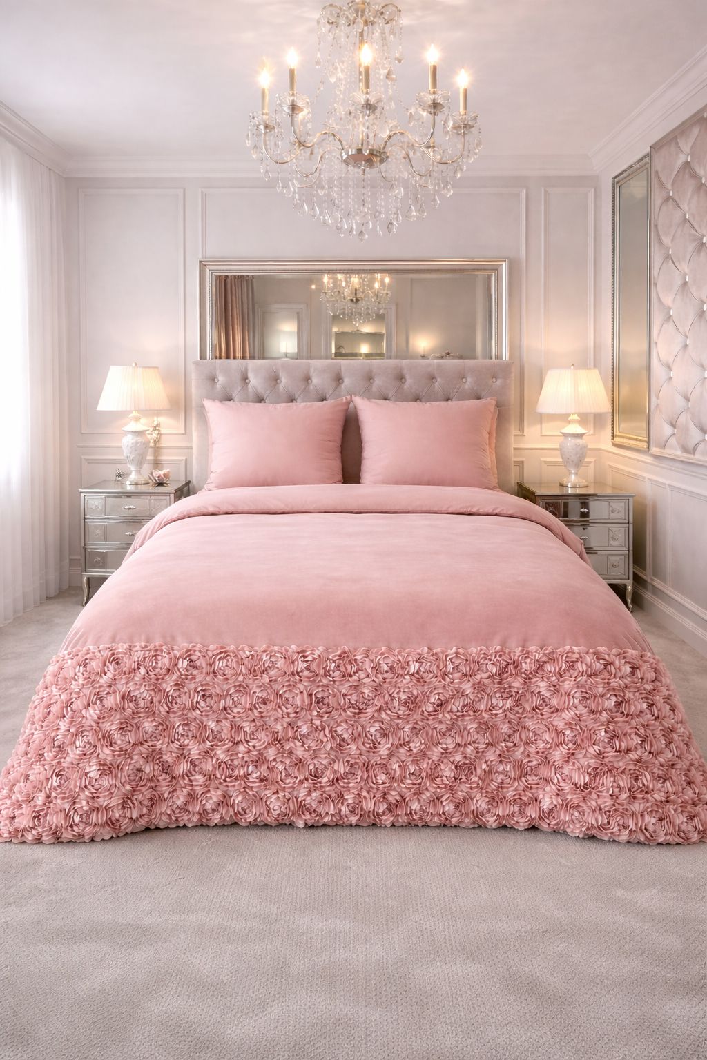 Narzuta Bella Roses doskonale sprawdzi się w eleganckich sypialniach, pokojach hotelowych oraz wnętrzach inspirowanych stylem klasycznym i glamour, podkreślając ich wyjątkowy charakter.