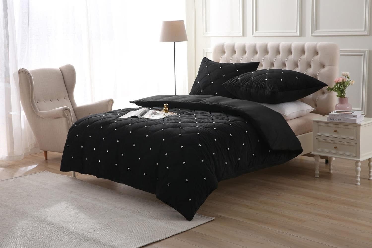 Geometryczne pikowanie w formie klasycznych rombów zostało ozdobione delikatnymi, mieniącymi się kryształkami, które nadają całości niepowtarzalnego charakteru. Dzięki nim narzuta pięknie odbija światło – zarówno naturalne, jak i sztuczne – tworząc efekt subtelnego połysku i eleganckiej faktury.