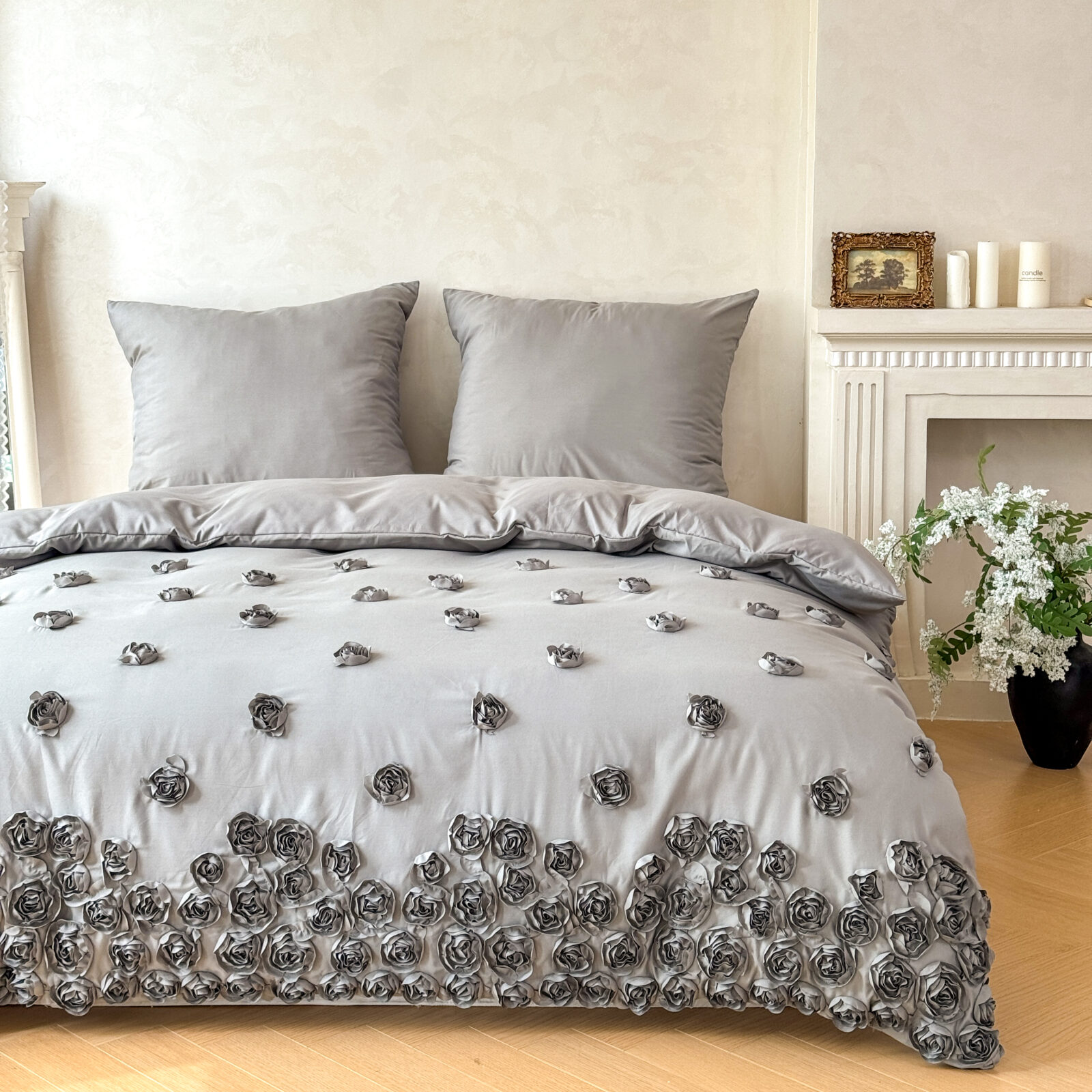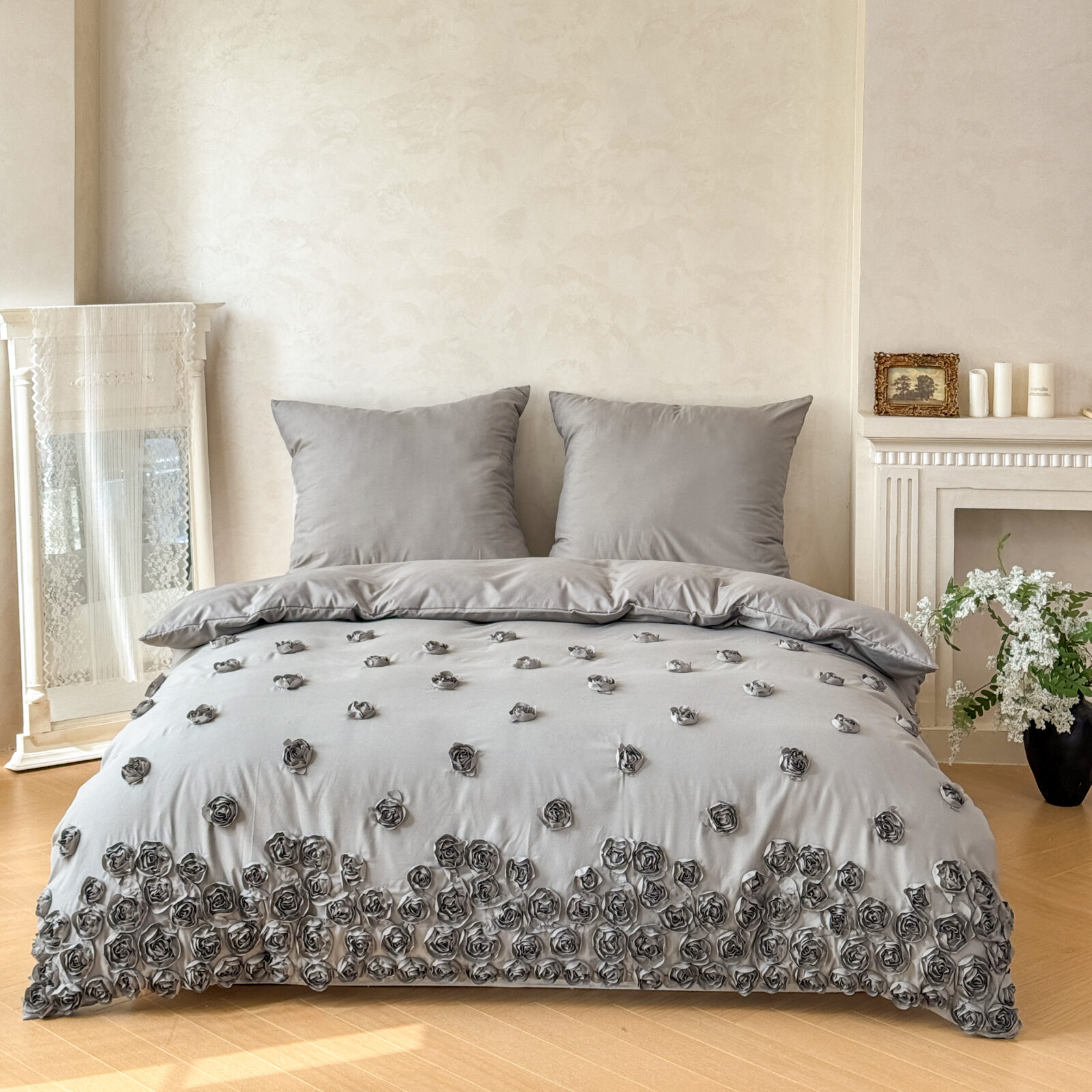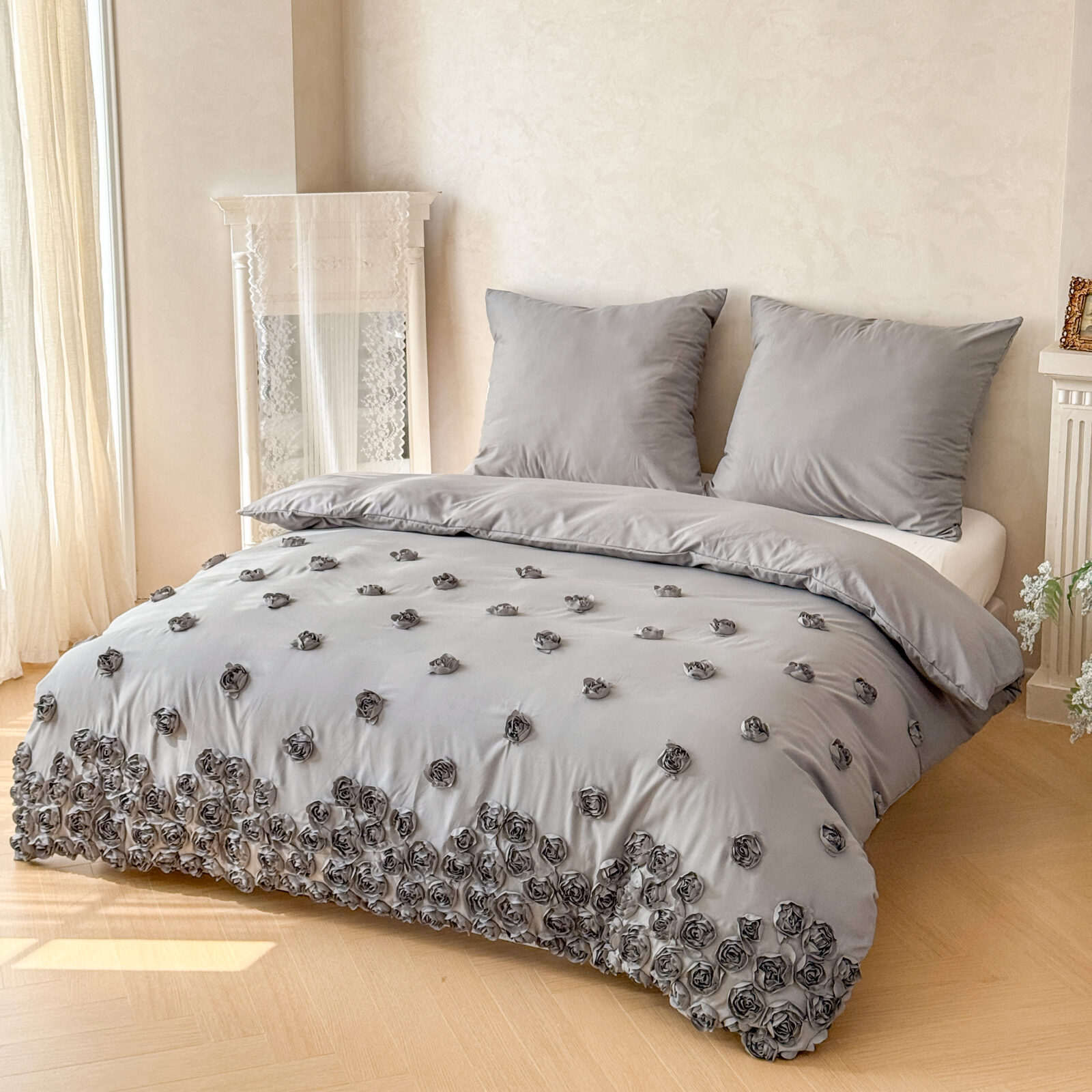 Pościel „French Roses” to wyjątkowy komplet, który wnosi do sypialni subtelny, romantyczny charakter. Wykonana z delikatnej mikrofibry, zachwyca miękkością, lekkością i eleganckim połyskiem. Jej największym atutem są starannie wyszywane róże — drobne kwiatowe aplikacje zdobiące całą powierzchnię, tworzące efekt luksusowej, trójwymiarowej dekoracji.