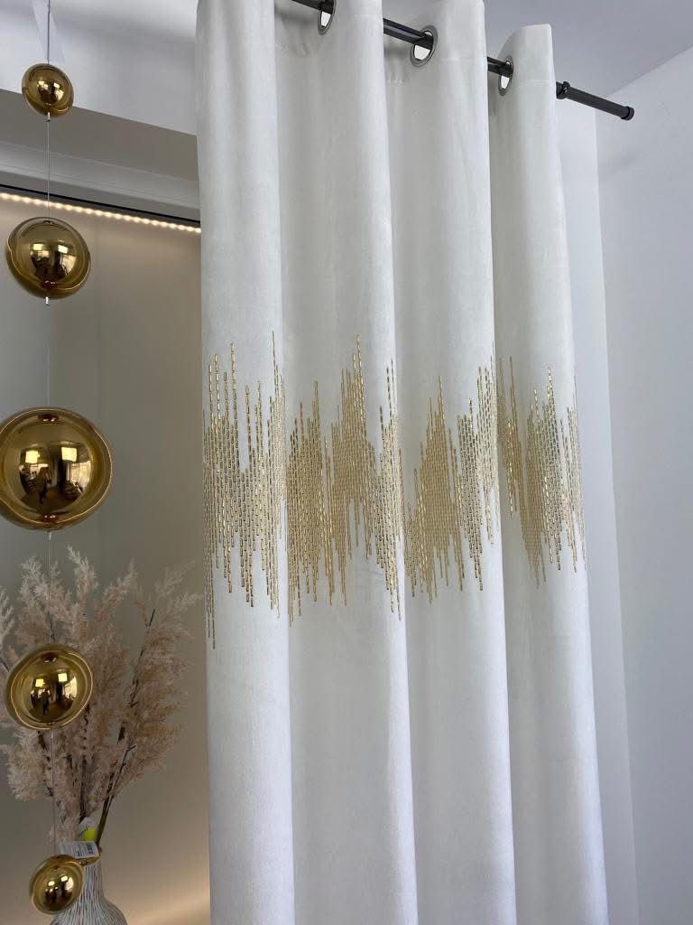 Zasłona wykonana została z wysokiej jakości, miękkiego i mięsistego weluru, który pięknie układa się w fale i subtelnie odbija światło, tworząc efekt głębi i luksusu. Dzięki aksamitnej strukturze tkanina wprowadza do pomieszczenia przytulną atmosferę i elegancki blask.