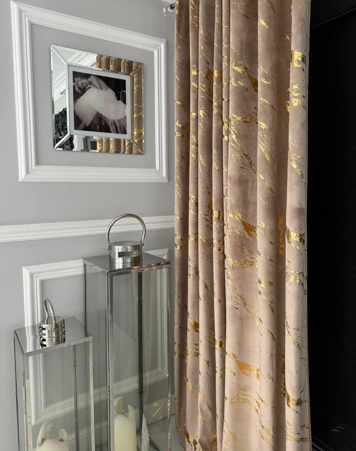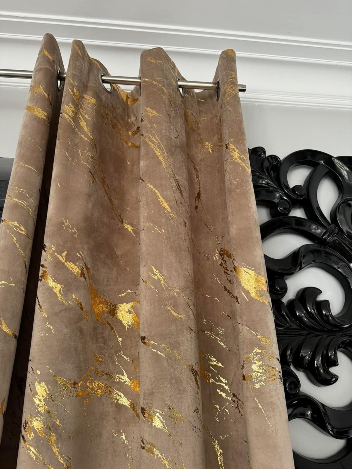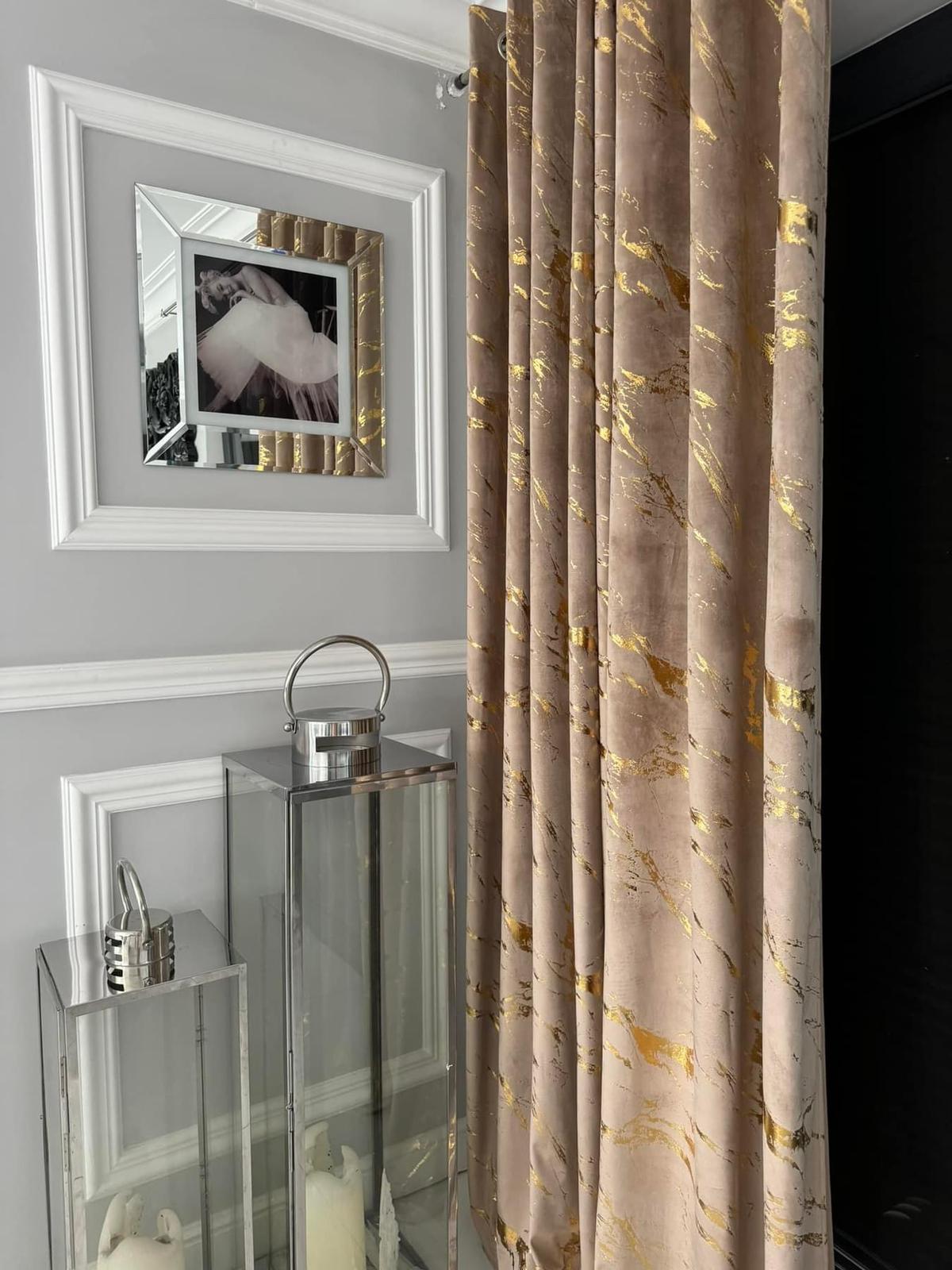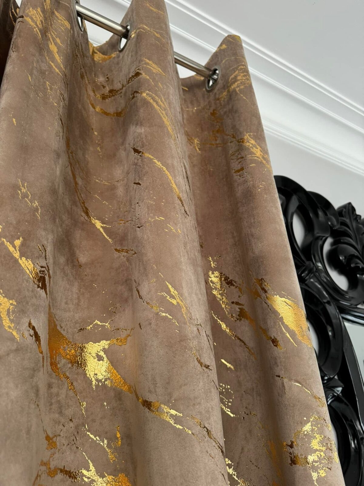 Całość dopełniają złote zdobienia, inspirowane naturalnymi żyłkami marmuru – delikatnie mieniące się w świetle, nadają zasłonie luksusowego charakteru i wyjątkowego blasku. Dzięki wygodnym przelotkom, zasłona doskonale układa się na karniszu, tworząc miękkie, eleganckie fale.