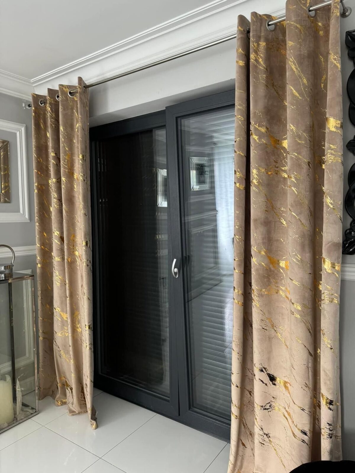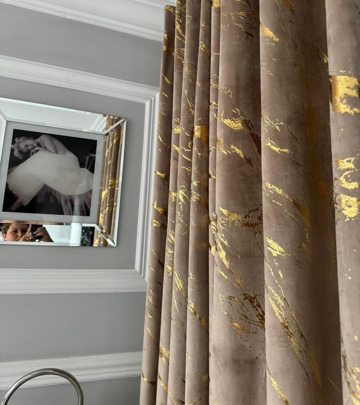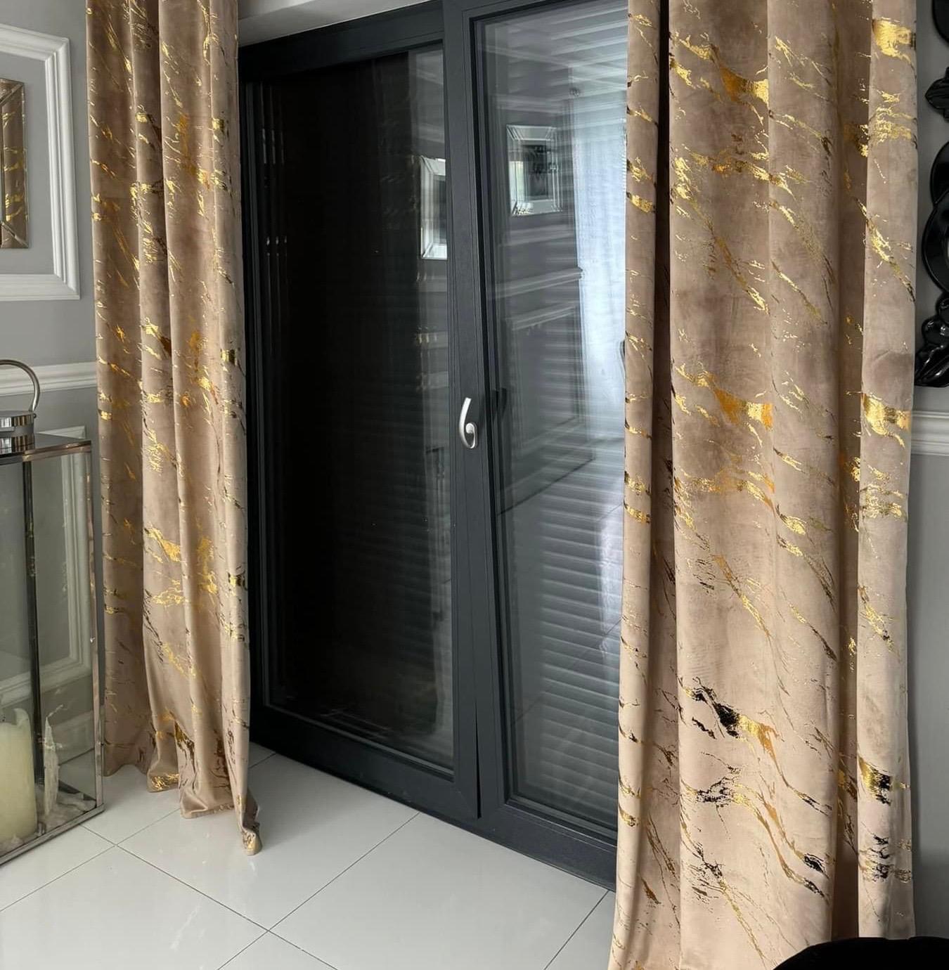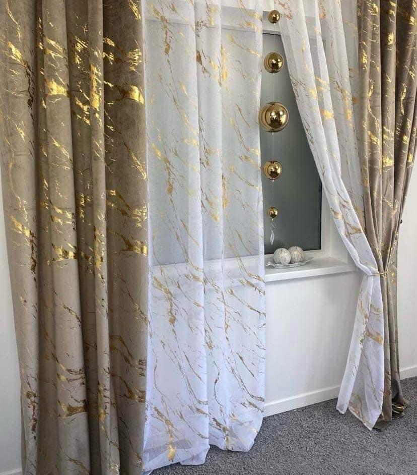Całość dopełniają złote zdobienia, inspirowane naturalnymi żyłkami marmuru – delikatnie mieniące się w świetle, nadają zasłonie luksusowego charakteru i wyjątkowego blasku. Dzięki wygodnym przelotkom, zasłona doskonale układa się na karniszu, tworząc miękkie, eleganckie fale.